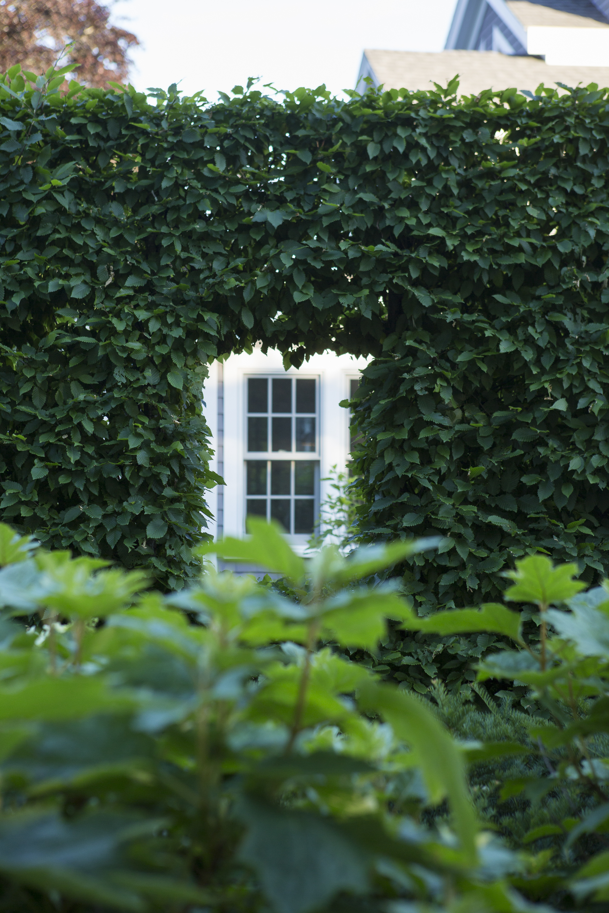 The spaces within and without this central garden are defined by Boxwood, Hornbeam, Beech, and Hemlock hedges with brick, gravel, and bluestone paths defining circulation.